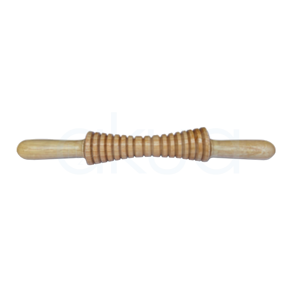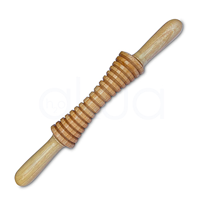 Rodillo de madera cuya zona central forma un cono alargado con estrías, estrecho en el centro y más ancho hacia los extremos, diseñado para trabajar en profundidad grasa localizada y flacidez en zonas muy concretas del cuerpo.