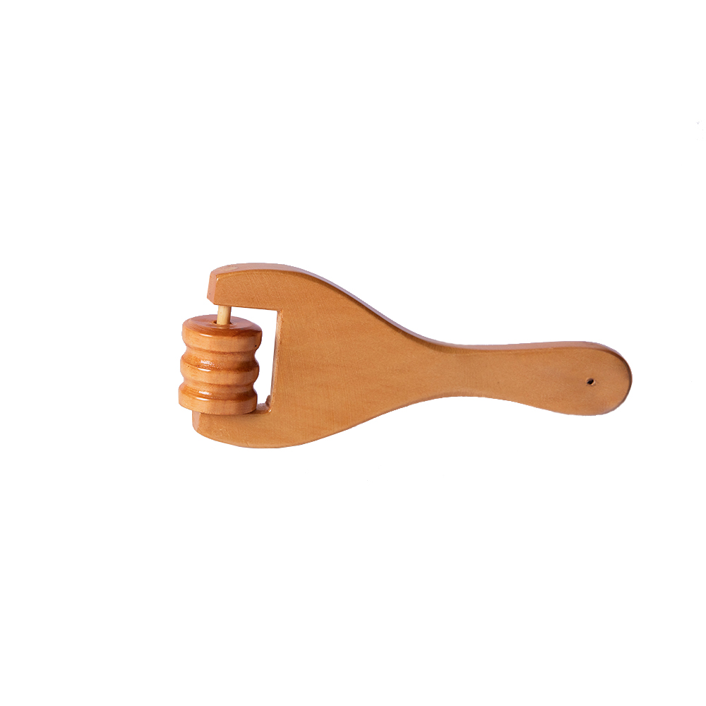 - Es un mini rodillo de madera (normalmente de loto) con superficie estriada, tamaño 12cm alto X 6cm ancho X 2cm alto, y mango ergonómico que facilita el manejo en rostro, cuello, manos y pies.