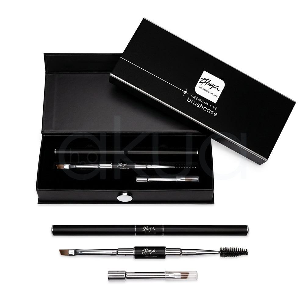 Estuche profesional con sistema de cabezales intercambiables diseñado específicamente para tratamientos de tinte y laminado de cejas/pestañas. Incluye 3-4 cabezales distintos en mango ergonómico negro metálico, con estuche rígido protector negro aterciopelado.