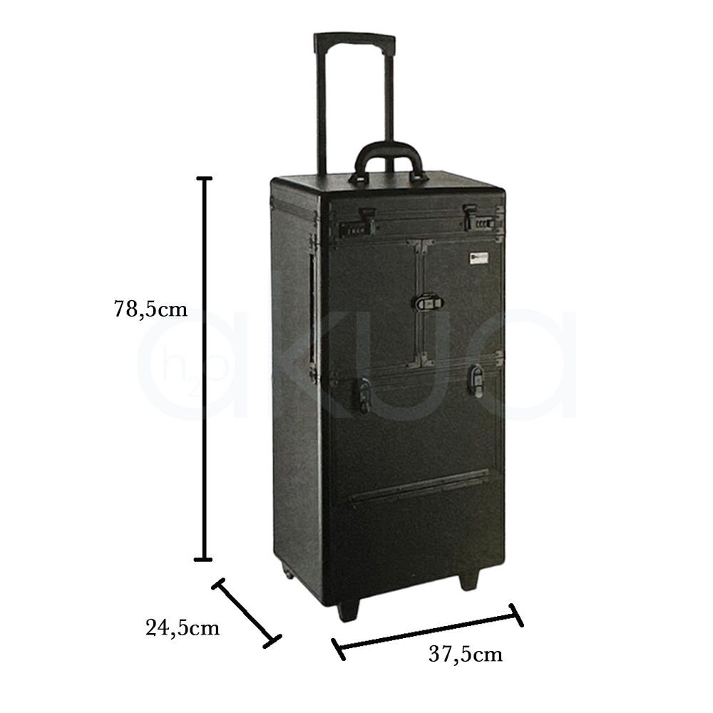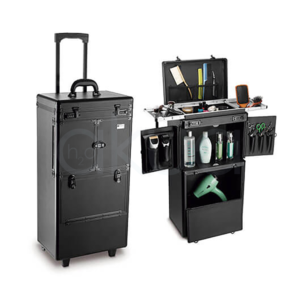 Trolley o maleta portátil negro con ruedas diseñado como asistente modular para profesionales, con gran capacidad para herramientas como tijeras, peines y secadores.