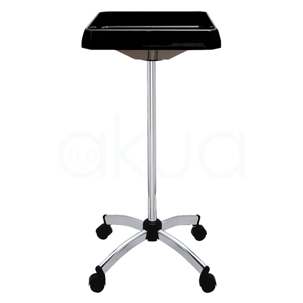 - Estructura con columna central de acero cromado de unos 90 cm de altura, bandeja rectangular negra de plástico ABS o polipropileno (aprox. 38 cm) con bordes elevados para retener productos como esmaltes o herramientas.