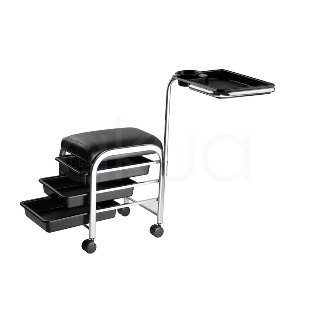 - Incluye un taburete acolchado blanco elevado sobre la estructura, ideal como reposapiés para el cliente durante pedicuras